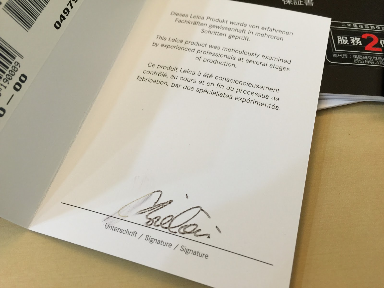 其中一張卡片特別引起了我的注意,上面印著品管人員的親筆簽名,證明這台相機出廠時經過了嚴格的把關。我還興奮地拿給家人看,想讓她知道 Leica 對品質的堅持。結果她老兄居然反問我:「這該不會是印刷的吧?」我也真是傻,居然就伸手去摸了一下,結果……就把人家的簽名給弄糊掉了!我們兩個當下真的成了「阿呆二人組」,現在想起來還是覺得好笑又有點糗。